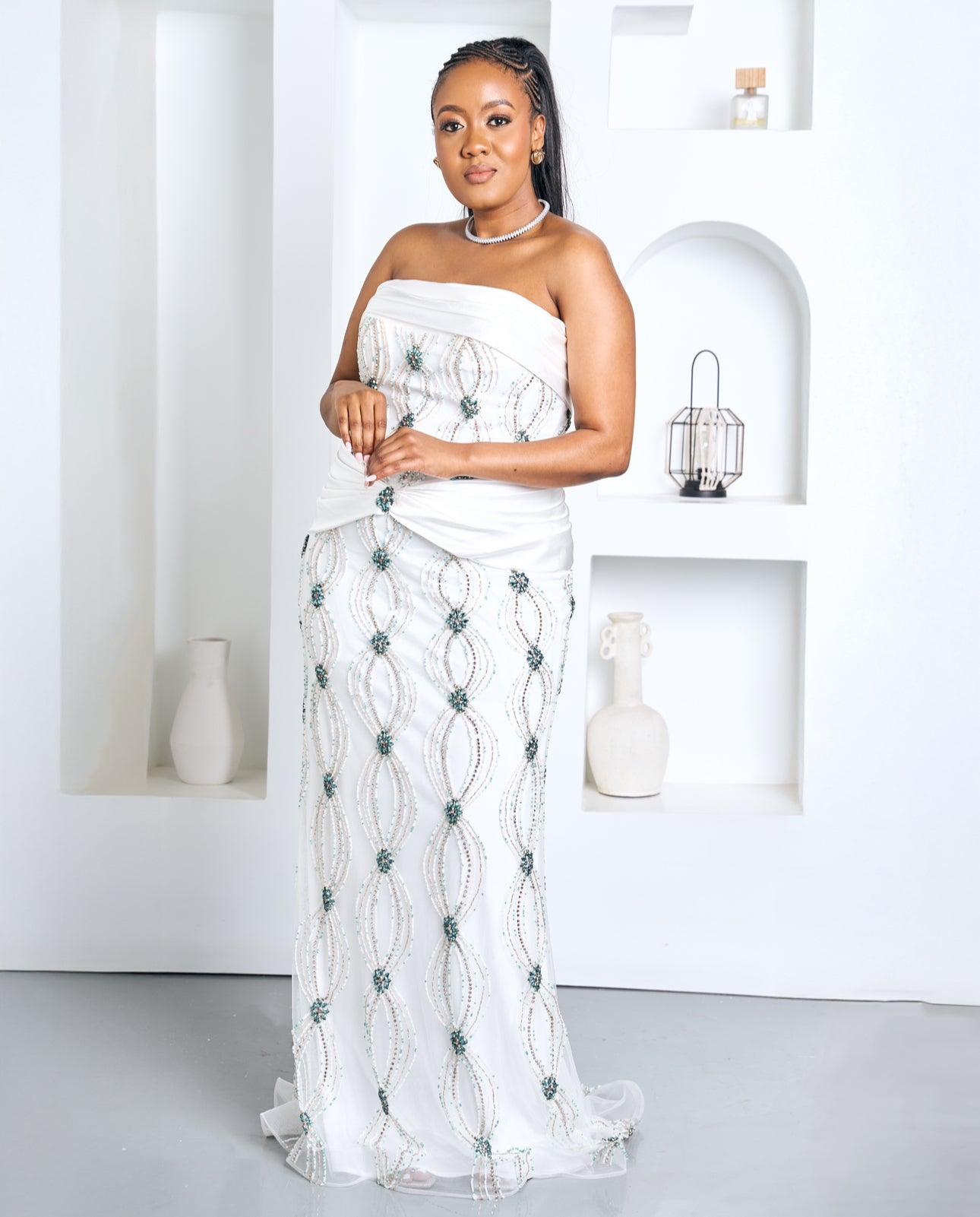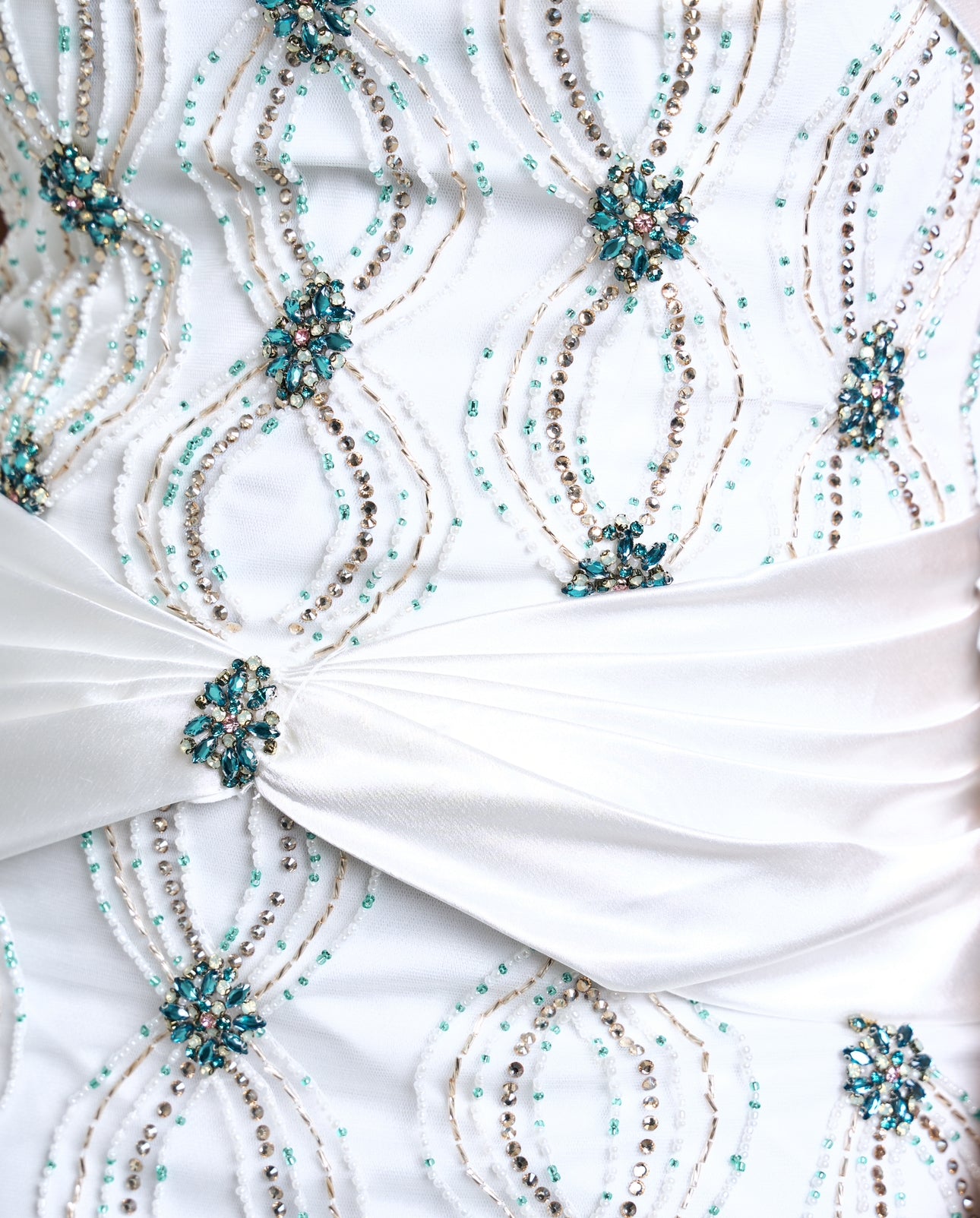 This elegant bobtube dress features a crisp white fabric decorated with sparkling turquoise, silver, and clear embellishments arranged in a wavy, symmetrical pattern. The detailing adds beautiful shine and dimension to the dress without appearing heavy. A smooth, gathered satin-style waistband enhances the silhouette and adds a touch of sophistication. The overall look is clean, classy, and perfect for special occasions or evening events.