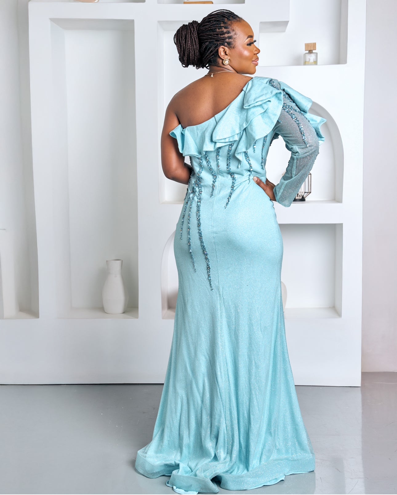 This one-shoulder aqua gown is designed to make a statement with its dramatic ruffle neckline and sculpted silhouette. The fitted bodice is detailed with shimmering beadwork that cascades down the dress in radiant lines, adding movement and sparkle. A sheer embellished sleeve adds a modern couture twist, while the thigh-high slit brings elegance and confidence. Crafted from a soft, glitter-sheen fabric, this gown flows beautifully with every step — perfect for galas, red-carpet events, or any moment that calls for undeniable presence.