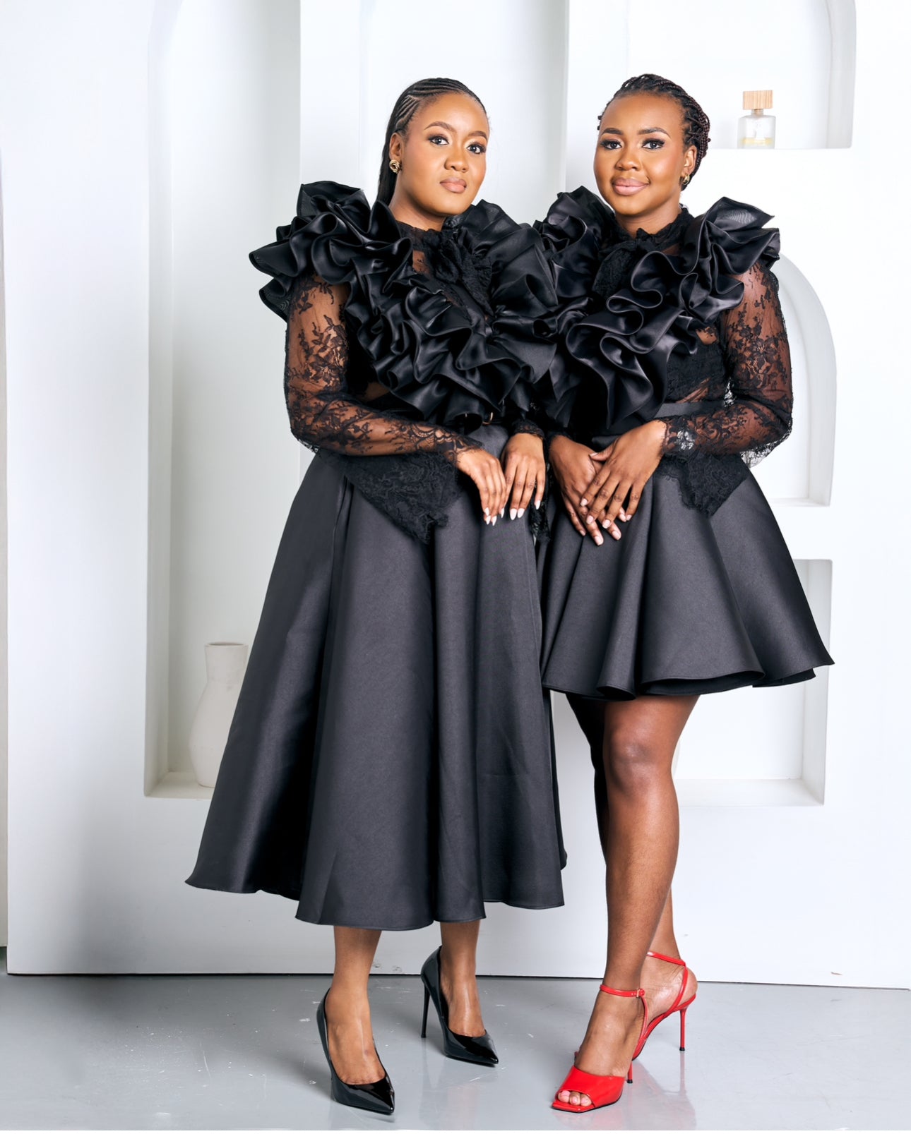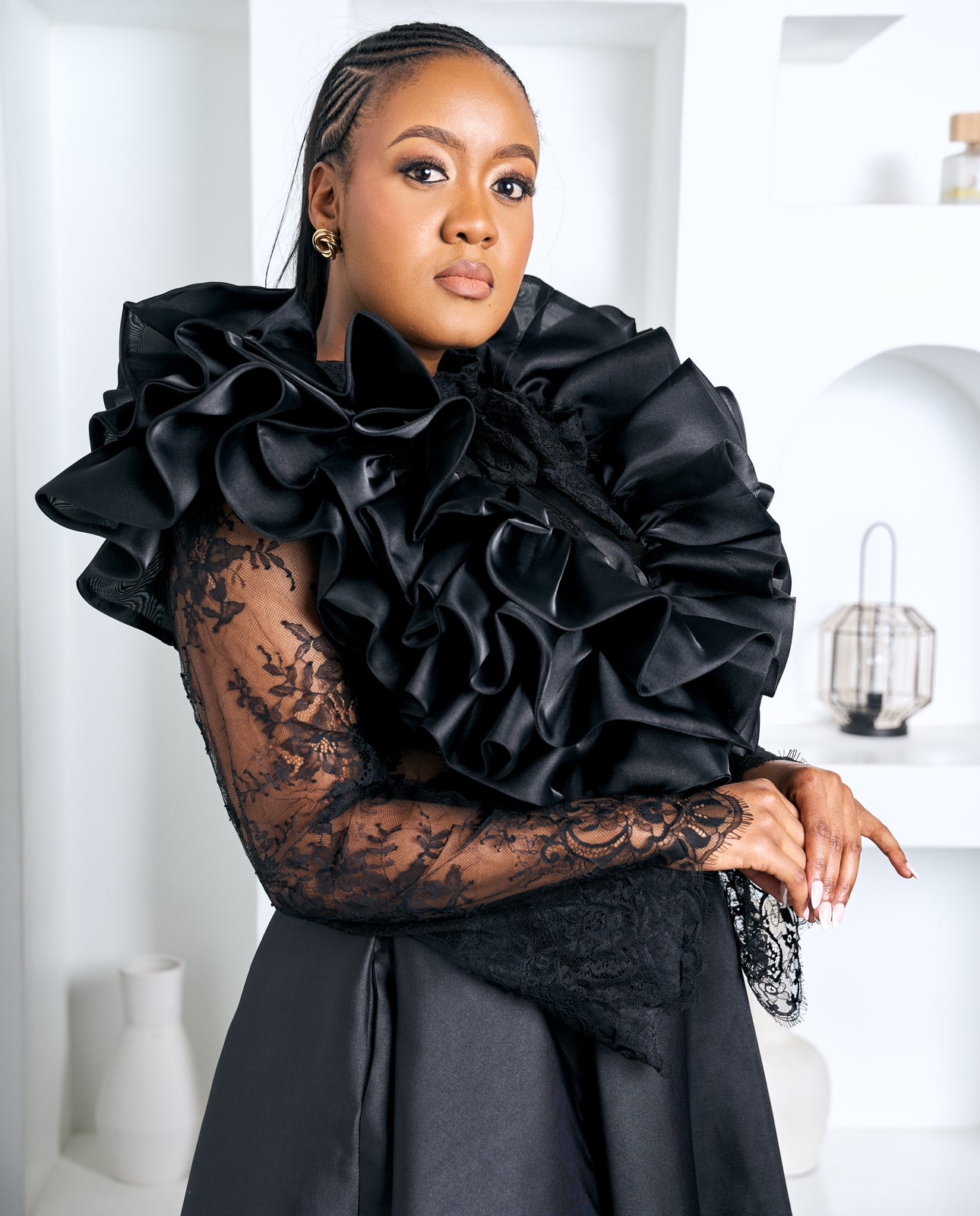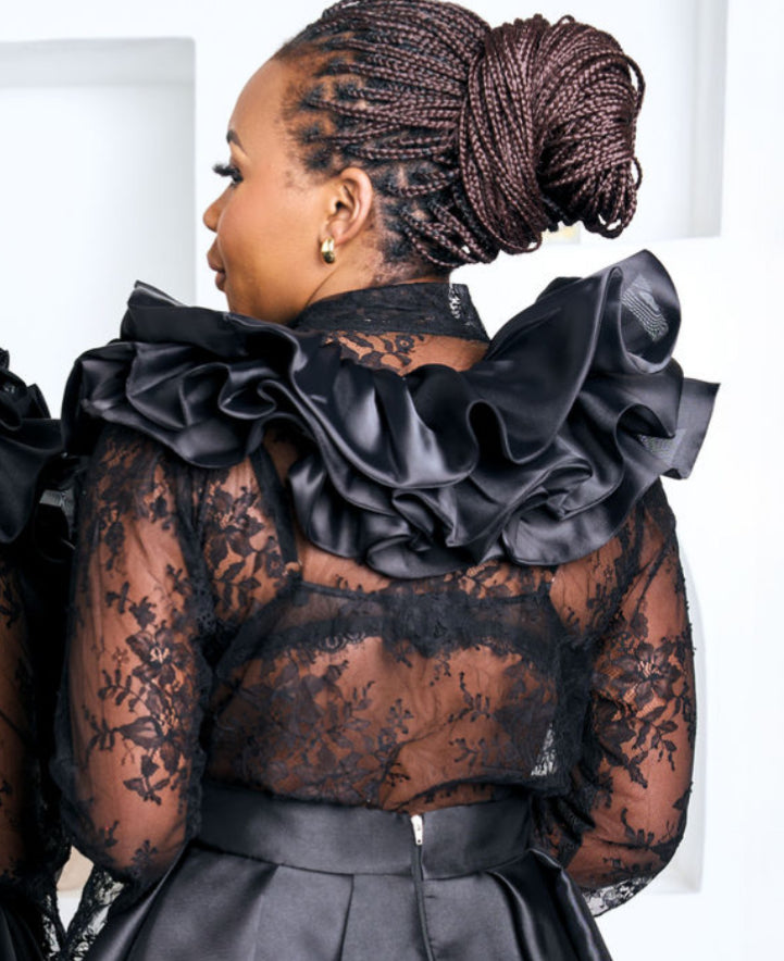 The Victoria Set is a statement of timeless couture elegance, crafted for the woman who commands presence without saying a word. This two-piece ensemble features a dramatic sculpted ruffle top, designed with layered satin waves and delicate lace sleeves that add depth, texture, and undeniable sophistication.